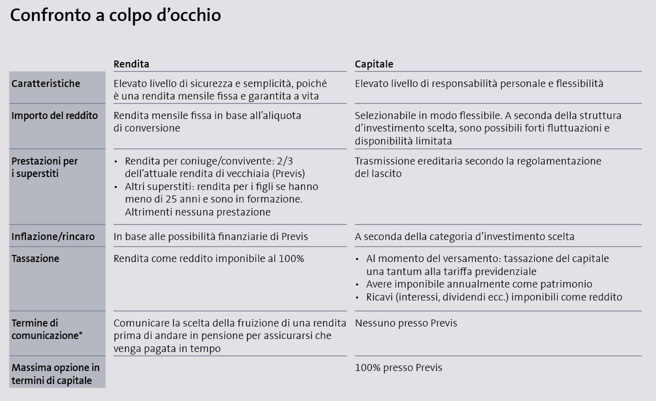 La fruizione di una rendita, insieme all’AVS, offre una fonte di reddito stabile e duratura. Questa sicurezza e il fatto di non dover gestire in prima persona gli averi di vecchiaia sono argomenti a favore di tale opzione. In alcuni casi, la fruizione di una rendita può essere altrettanto interessante se al momento del pensionamento si ha diritto a prestazioni supplementari come la rendita per i figli. Se le spese essenziali e necessarie per vivere sono coperte dai redditi da rendita o da altri introiti fissi come le pigioni, si può prendere in considerazione una liquidazione in capitale.
